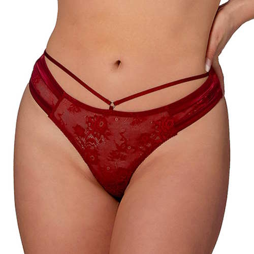 This Tender thong is a perfect addition to your set. This thong, in dark red color, is carefully designed with lace and has strap details that complete the luxurious look of the set. With its comfortable fit and seductive design, the Tender thong is a must-have in your underwear collection.