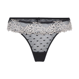 Black & Sand Fall in love with details! This series features sand-colored embroidery to fall in love with. This semi-transparent thong is made entirely of mesh & embroidery and has a lined crotch.