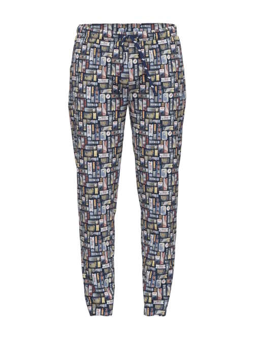 Eye-catching blue men's pajama pants from A Fish named Fred. The long pajama pants have side pockets. The waistband is elastic and has a drawstring. The drawstring features silhouettes of small fish. The pajama pants are made of pure cotton.